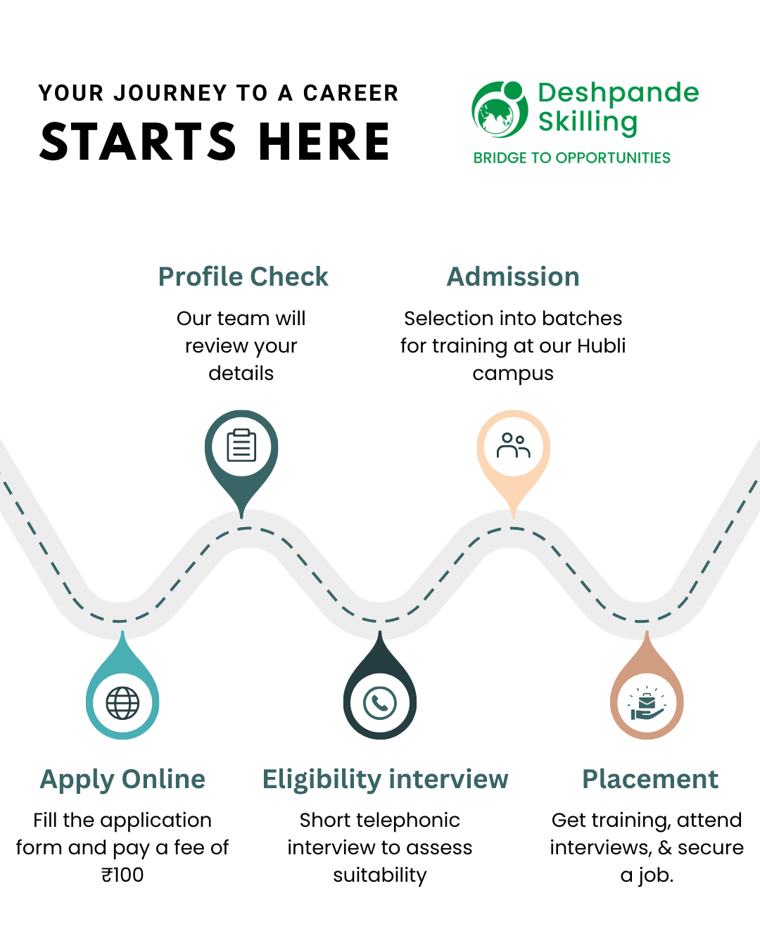 The training happens at our 7-acre residential campus in Hubballi, Karnataka, equipped with separate hostels for boys and girls, canteen, classrooms.